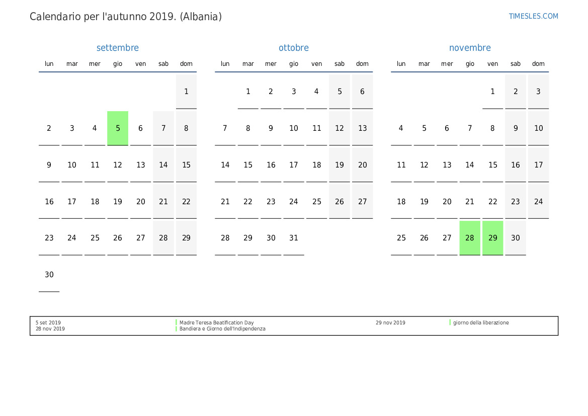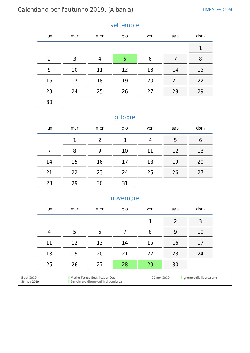 Scarica e stampa il calendario PDF con i giorni festivi e i fine settimana per l'autunno 2019per l'Albania