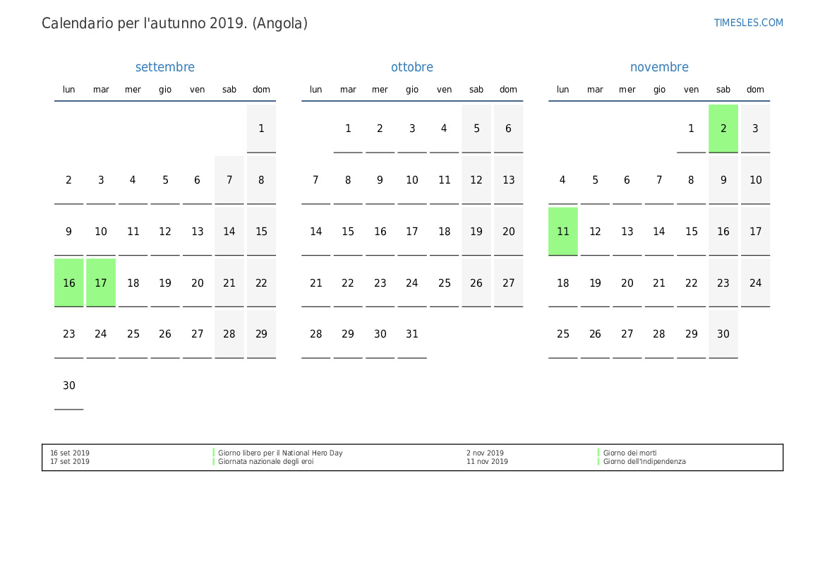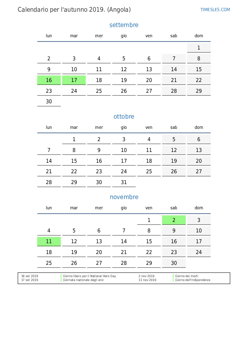 Scarica e stampa il calendario PDF con i giorni festivi e i fine settimana per l'autunno 2019per l'Angola