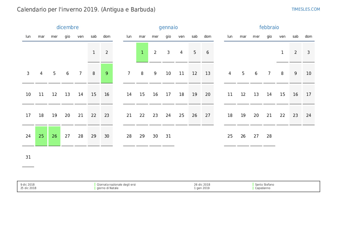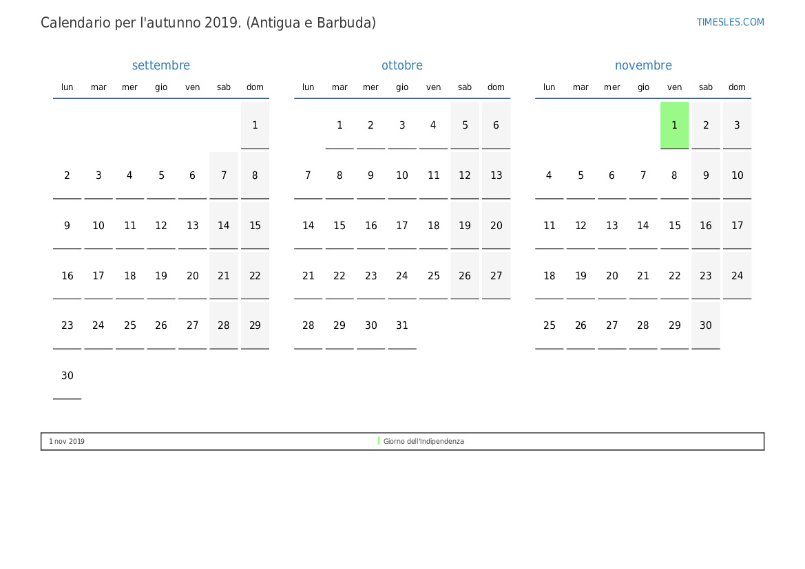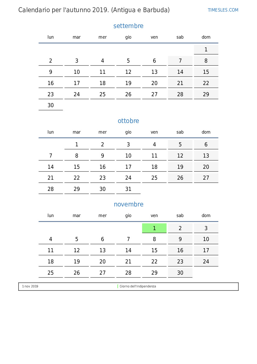 Calendario per l'autunno 2019 per Antigua e Barbuda