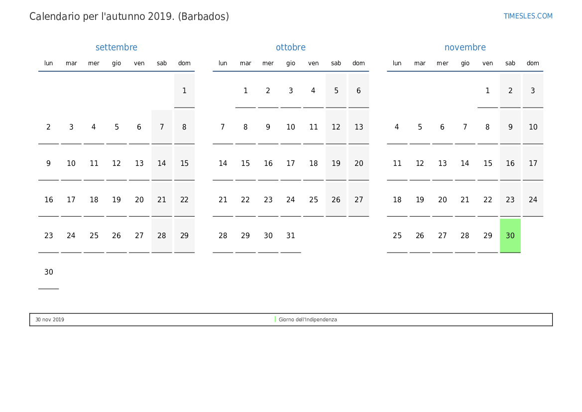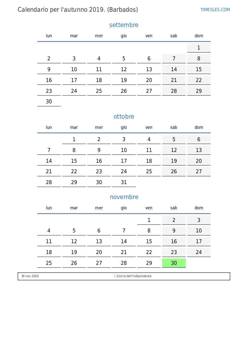 Calendario per l'autunno 2019 per Barbados