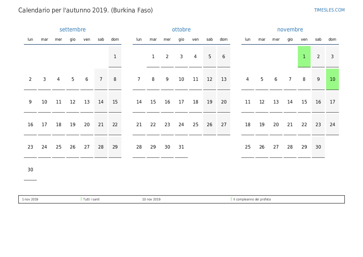 Scarica e stampa il calendario PDF con i giorni festivi e i fine settimana per l'autunno 2019per il Burkina Faso