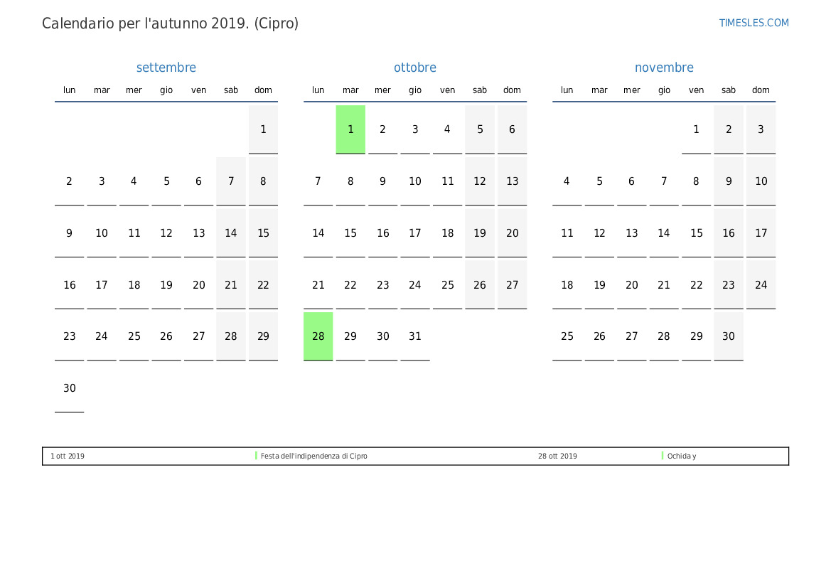 Calendario delle festività e dei fine settimana per l'autunno 2019 per Cipro