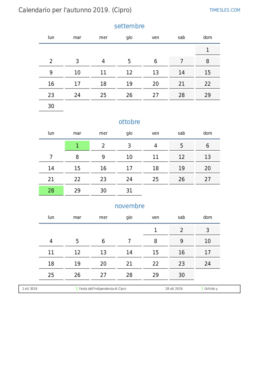 Scarica e stampa il calendario PDF con i giorni festivi e i fine settimana per l'autunno 2019per Cipro