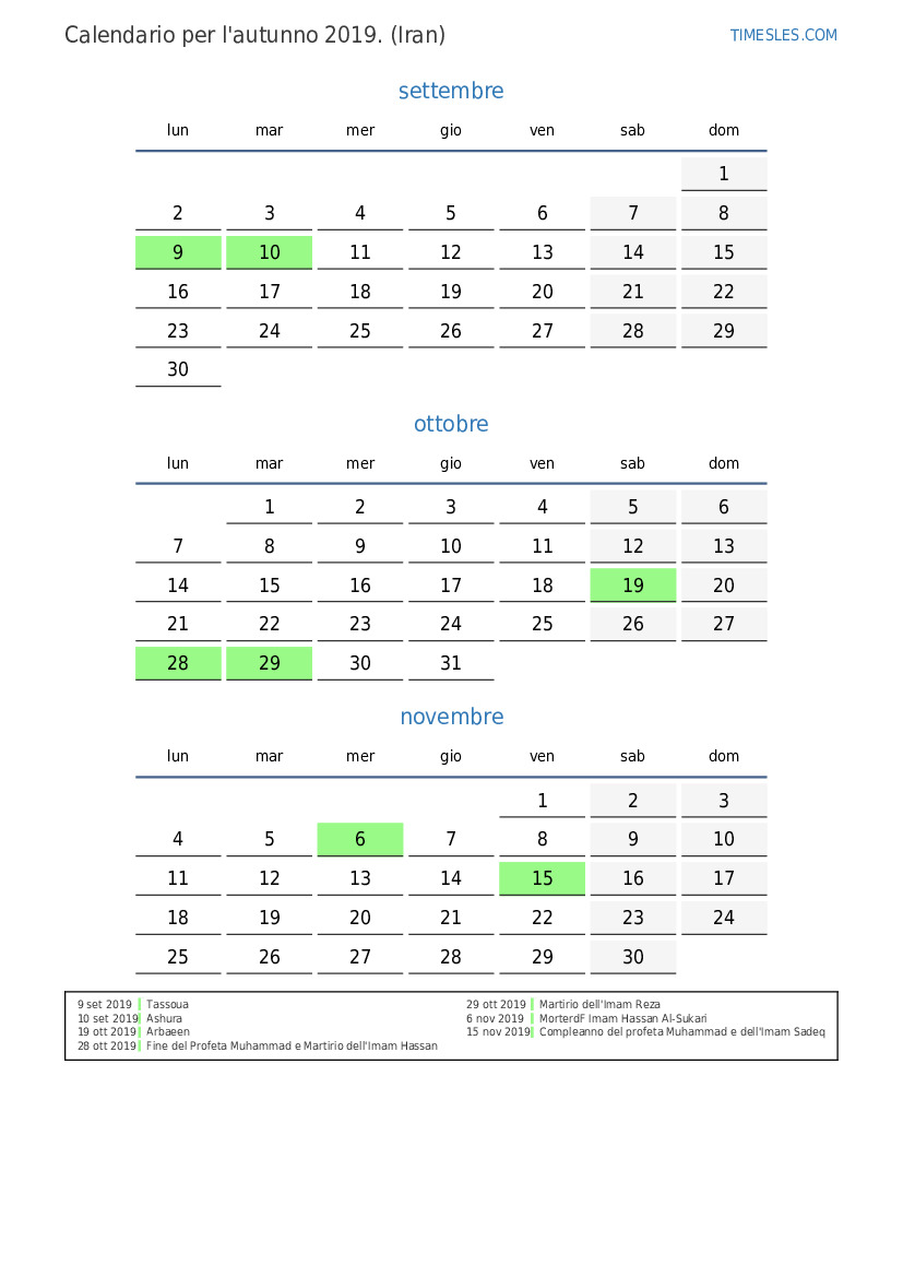 Scarica e stampa il calendario PDF con i giorni festivi e i fine settimana per l'autunno 2019per l'Iran