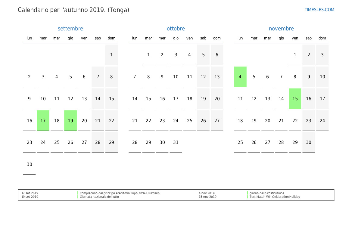 Scarica e stampa il calendario PDF con i giorni festivi e i fine settimana per l'autunno 2019per Tonga