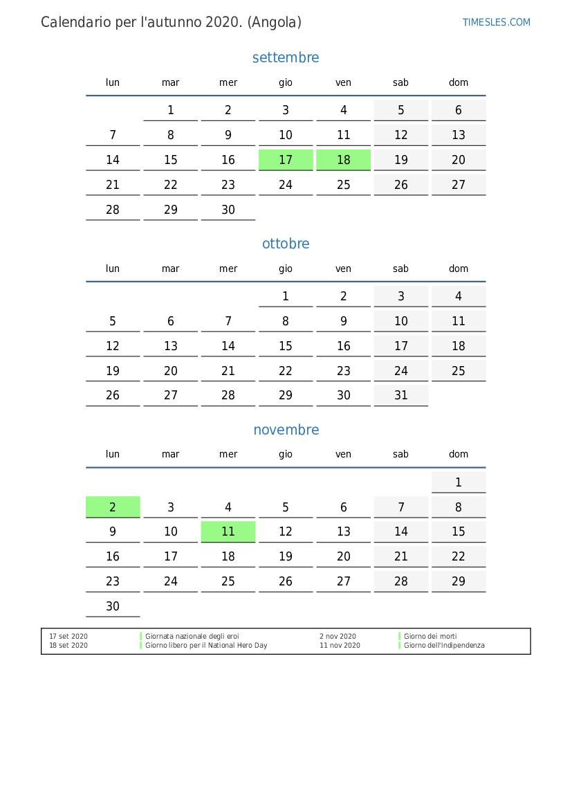 Scarica e stampa il calendario PDF con i giorni festivi e i fine settimana per l'autunno 2020per l'Angola