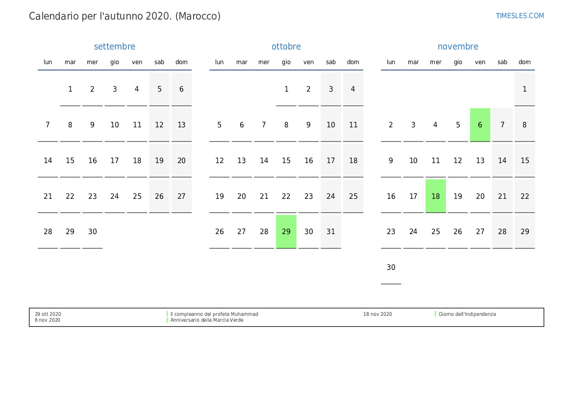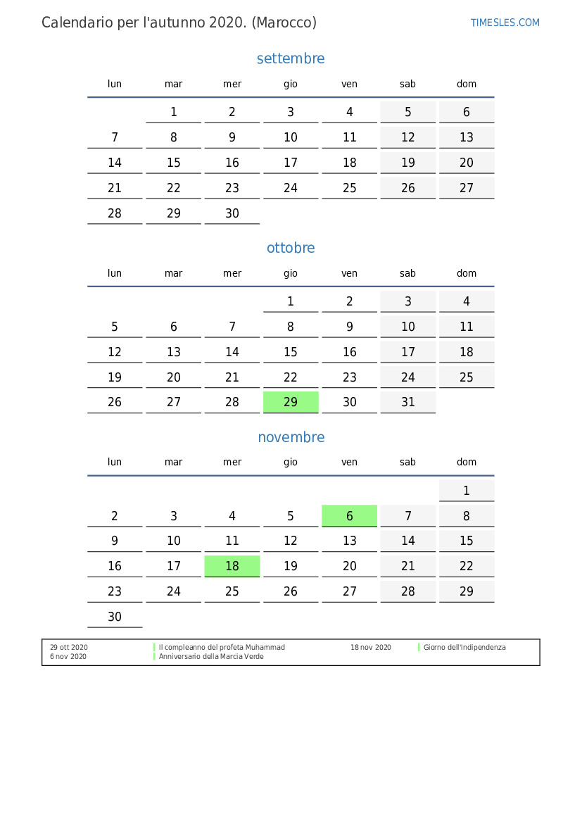Scarica e stampa il calendario PDF con i giorni festivi e i fine settimana per l'autunno 2020per il Marocco