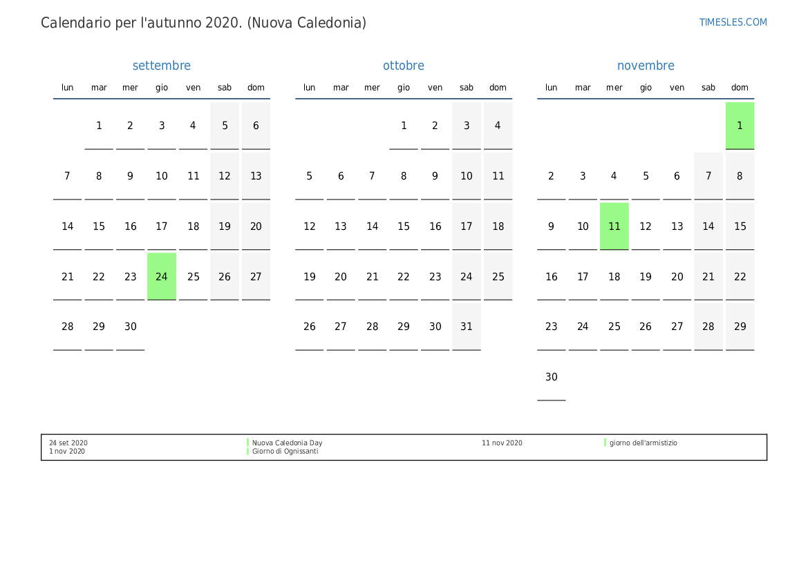 Calendario delle festività e dei fine settimana per l'autunno 2020 per la Nuova Caledonia