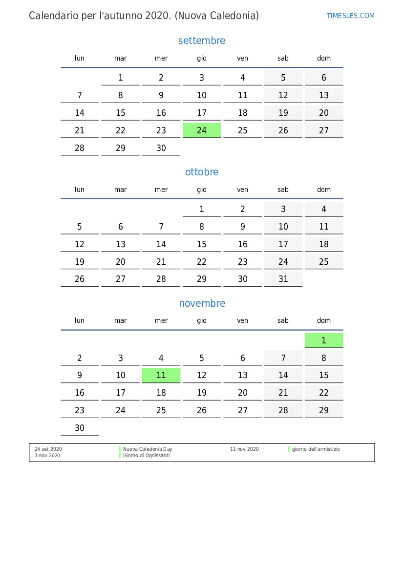 Scarica e stampa il calendario PDF con i giorni festivi e i fine settimana per l'autunno 2020per la Nuova Caledonia