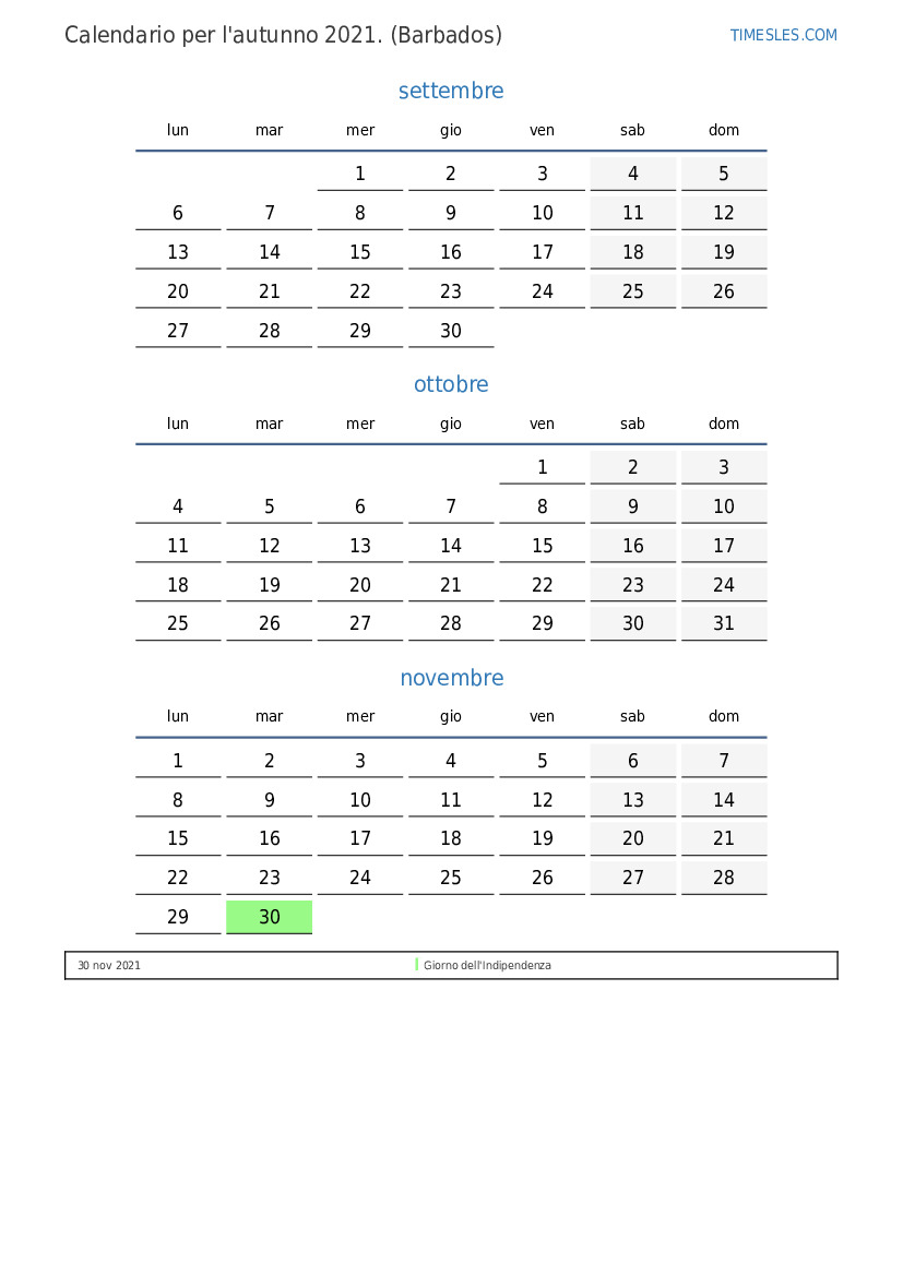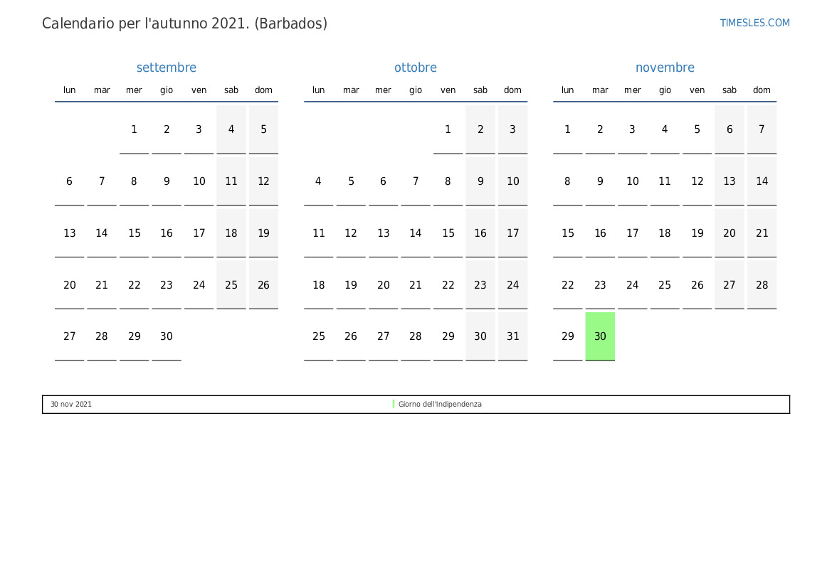 Calendario per l'autunno 2021 per Barbados