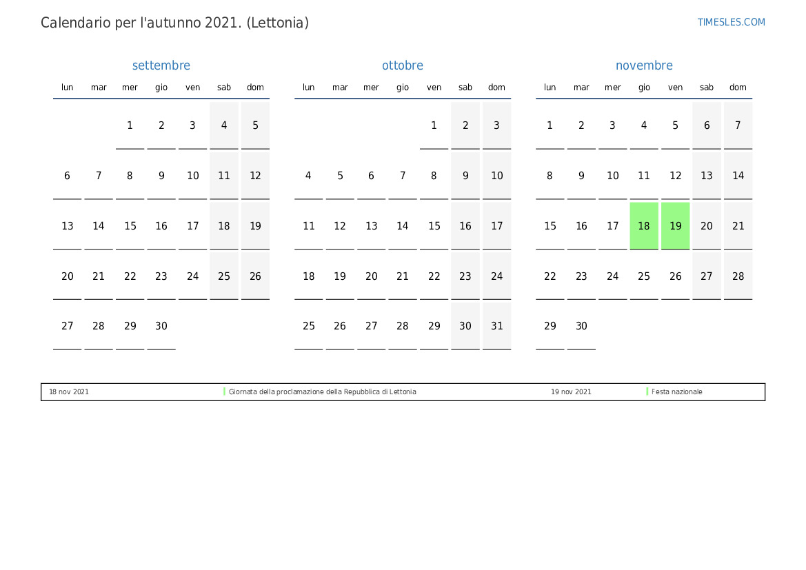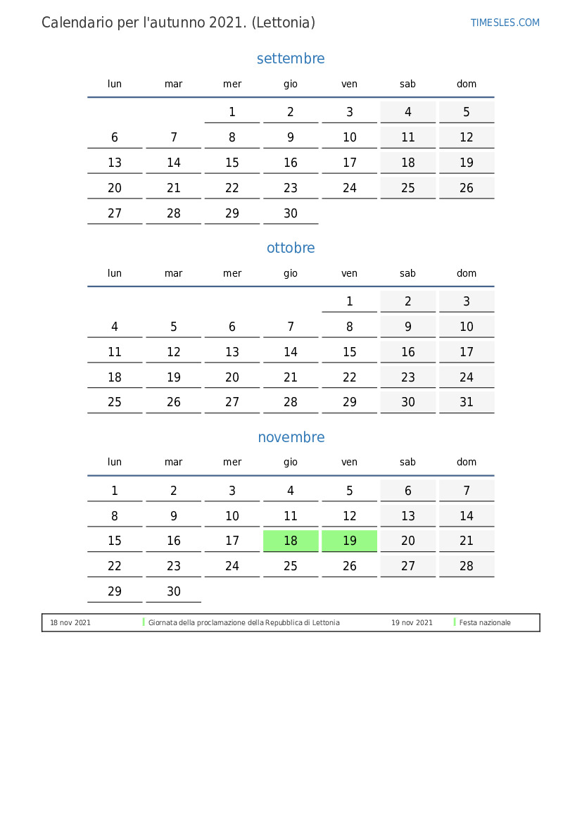 Scarica e stampa il calendario PDF con i giorni festivi e i fine settimana per l'autunno 2021per la Lettonia