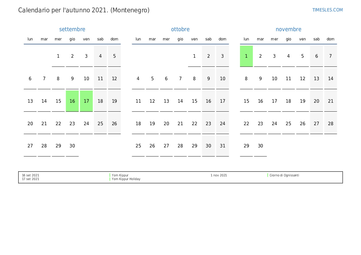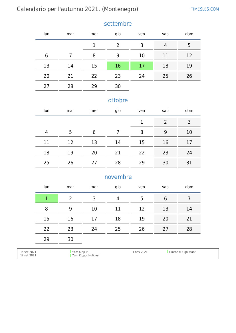 Scarica e stampa il calendario PDF con i giorni festivi e i fine settimana per l'autunno 2021per il Montenegro