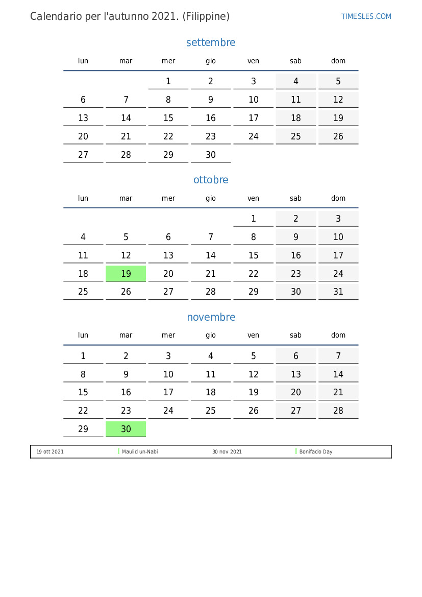 Scarica e stampa il calendario PDF con i giorni festivi e i fine settimana per l'autunno 2021per le Filippine