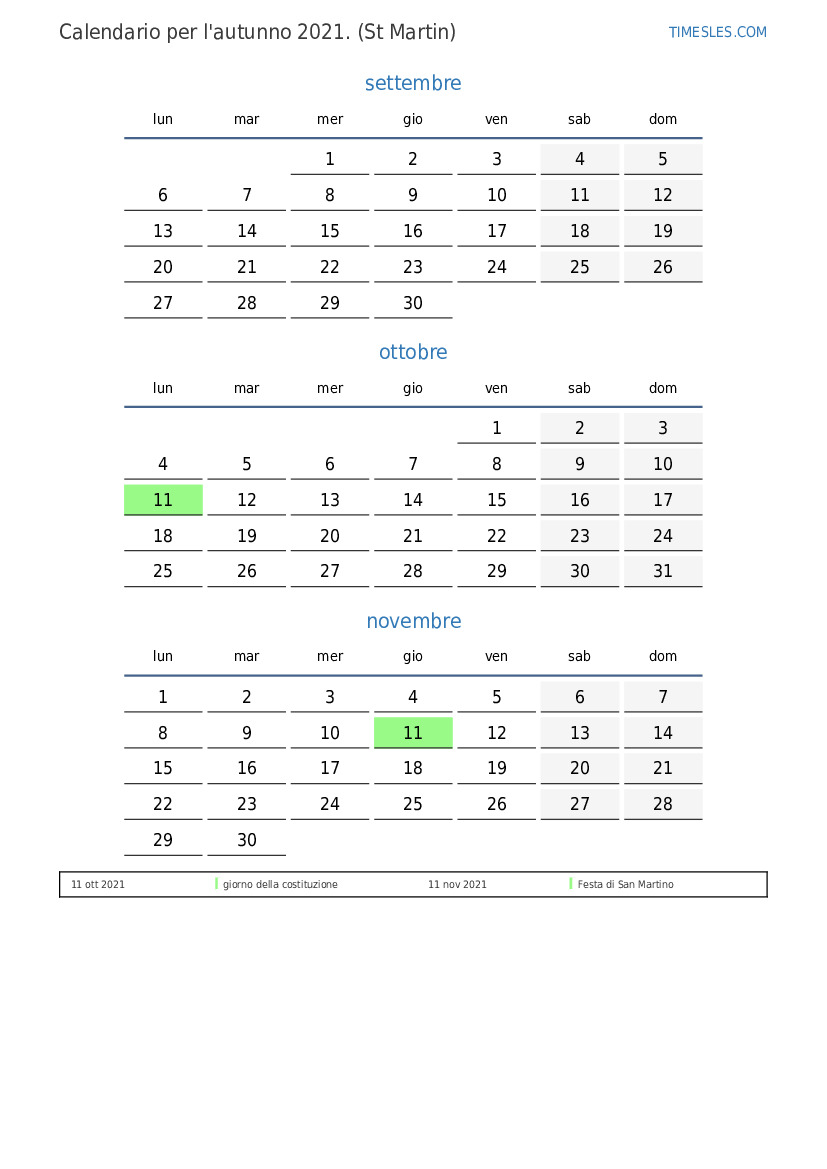 Scarica e stampa il calendario PDF con i giorni festivi e i fine settimana per l'autunno 2021per Sint Maarten