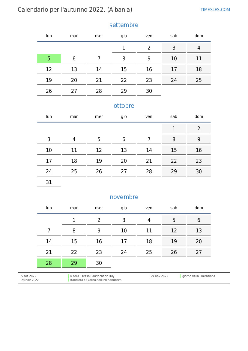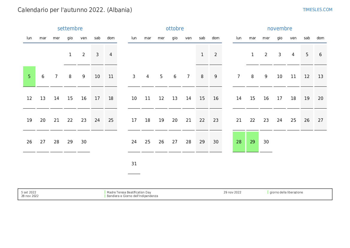 Scarica e stampa il calendario PDF con i giorni festivi e i fine settimana per l'autunno 2022per l'Albania