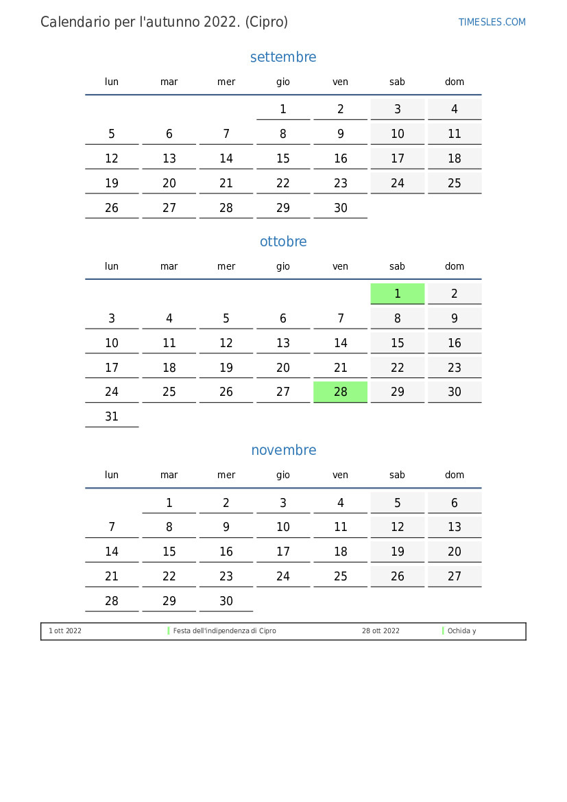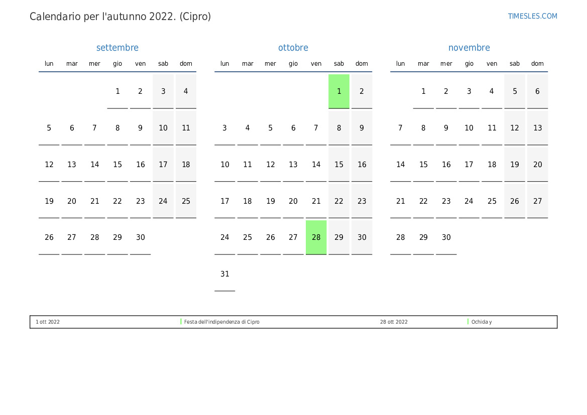Scarica e stampa il calendario PDF con i giorni festivi e i fine settimana per l'autunno 2022per Cipro