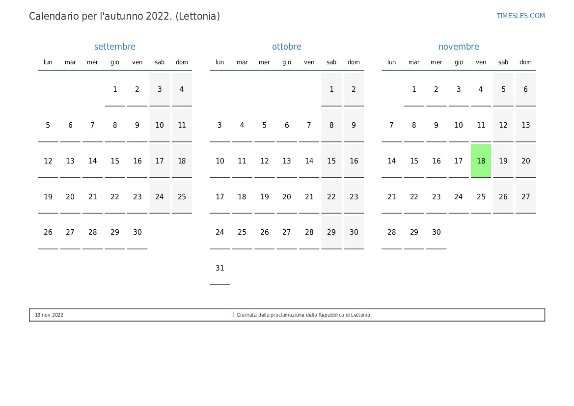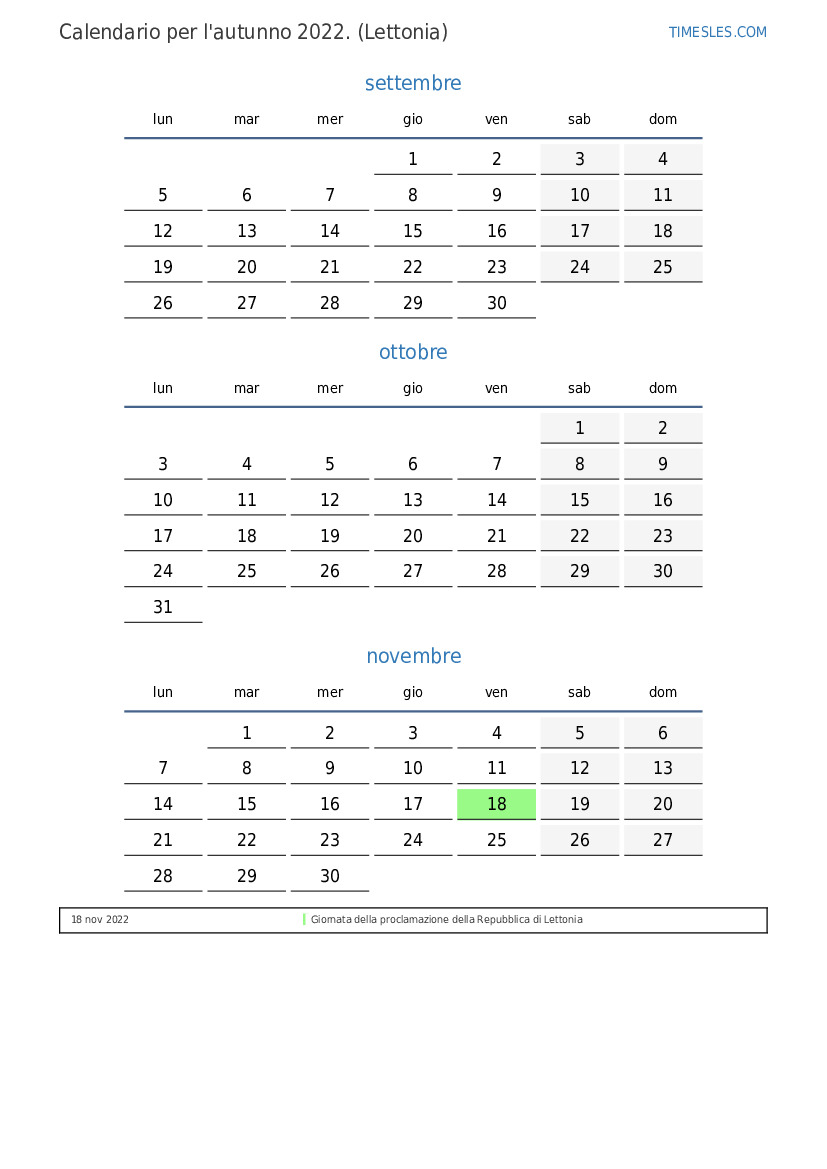 Scarica e stampa il calendario PDF con i giorni festivi e i fine settimana per l'autunno 2022per la Lettonia