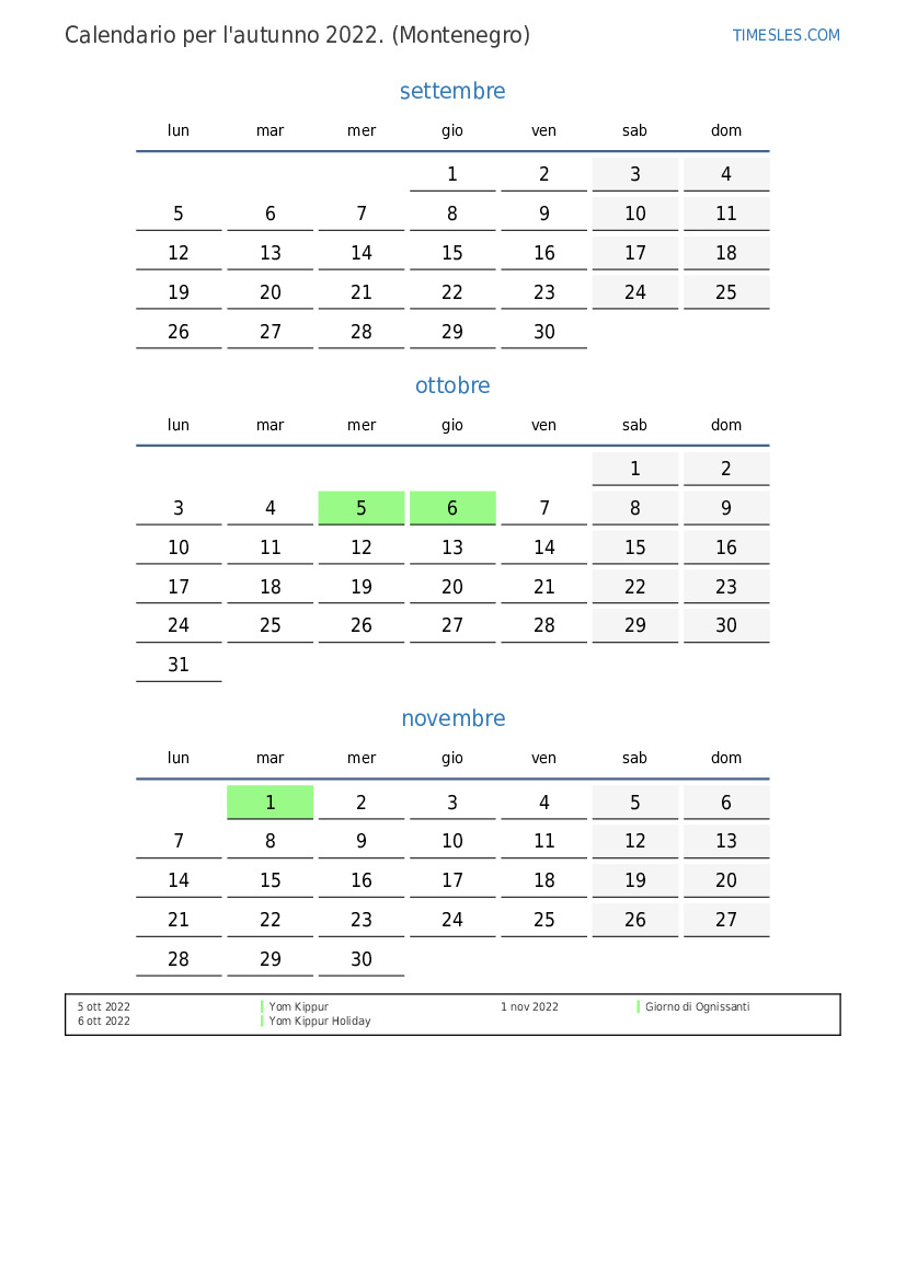 Scarica e stampa il calendario PDF con i giorni festivi e i fine settimana per l'autunno 2022per il Montenegro