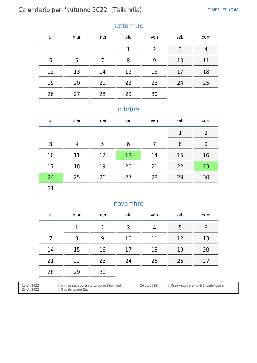 Scarica e stampa il calendario PDF con i giorni festivi e i fine settimana per l'autunno 2022per la Thailandia