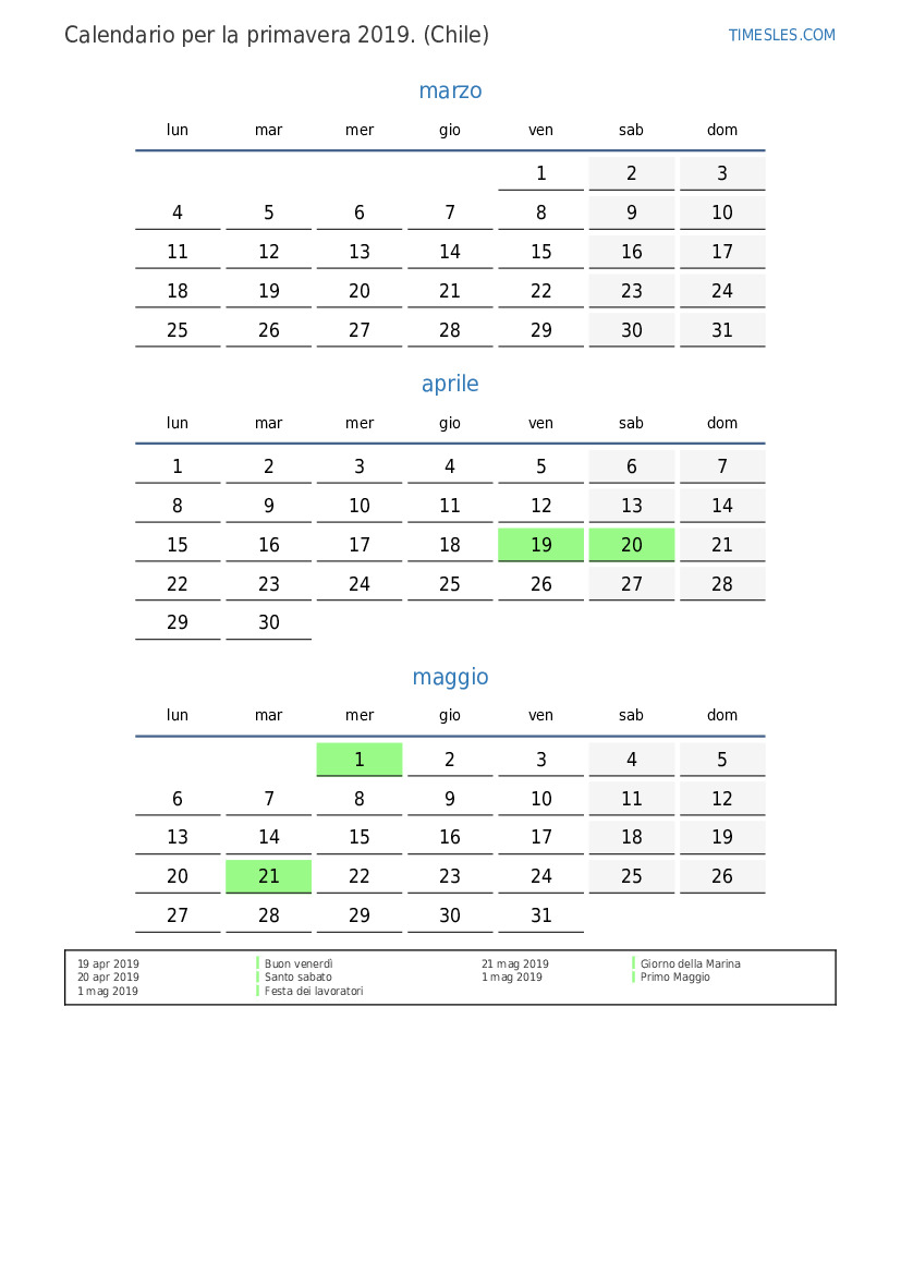 Scarica e stampa il calendario PDF con i giorni festivi e i fine settimana per la primavera 2019per il Cile