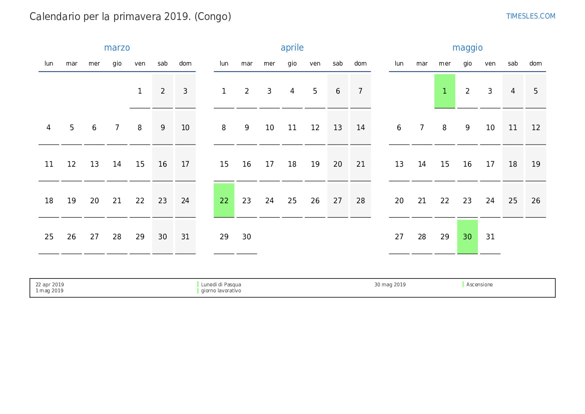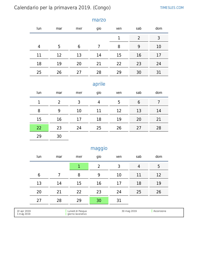 Scarica e stampa il calendario PDF con i giorni festivi e i fine settimana per la primavera 2019per il Congo