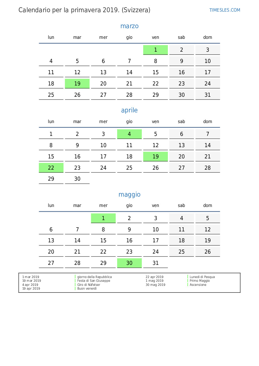 Scarica e stampa il calendario PDF con i giorni festivi e i fine settimana per la primavera 2019per la Svizzera
