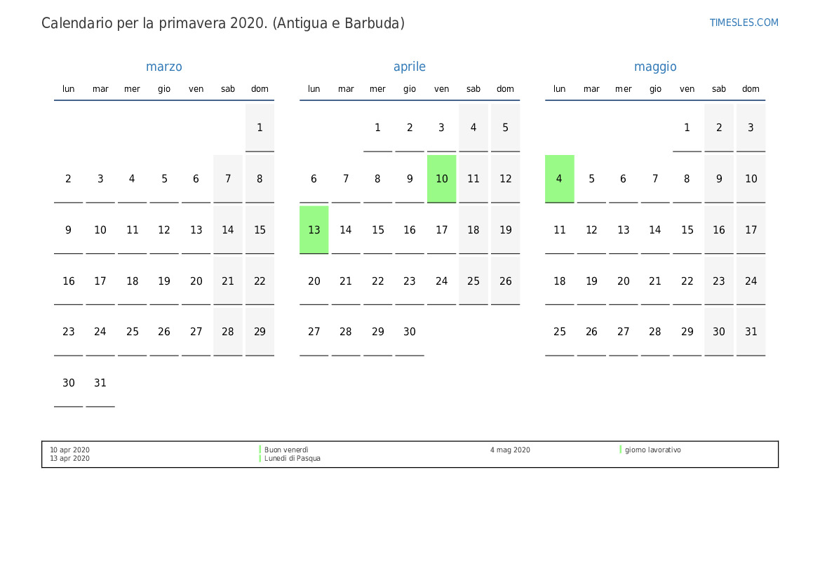 Scarica e stampa il calendario PDF con i giorni festivi e i fine settimana per la primavera 2020per Antigua e Barbuda