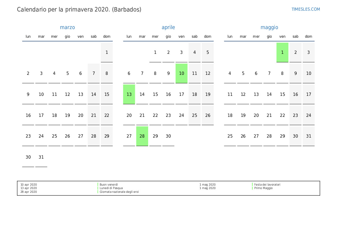 Scarica e stampa il calendario PDF con i giorni festivi e i fine settimana per la primavera 2020per Barbados