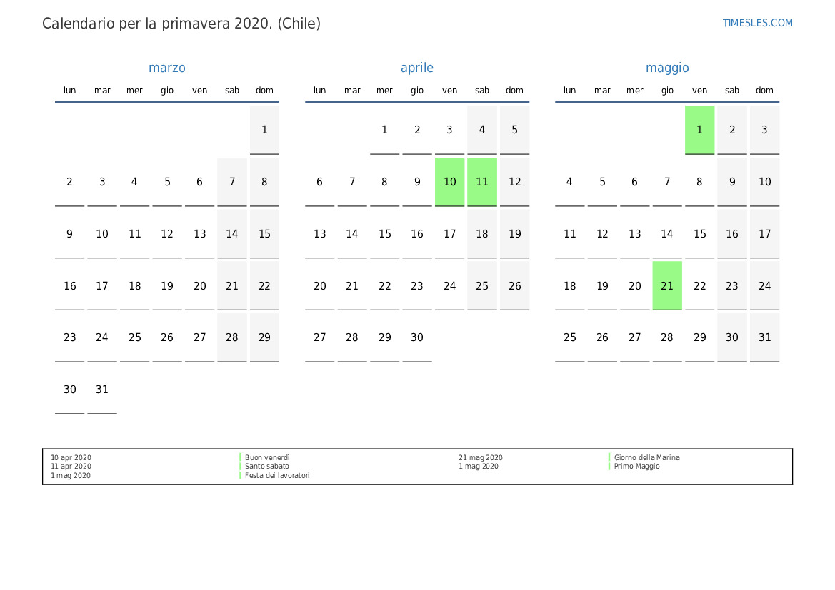 Scarica e stampa il calendario PDF con i giorni festivi e i fine settimana per la primavera 2020per il Cile