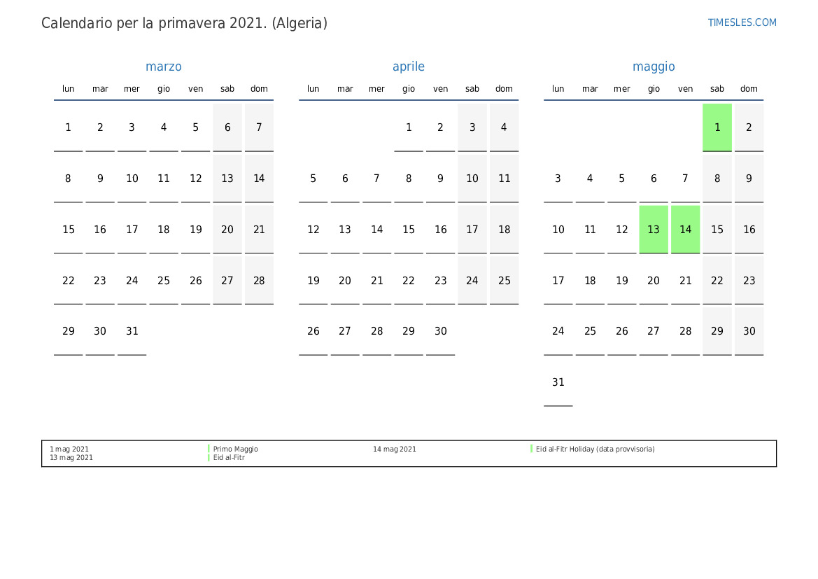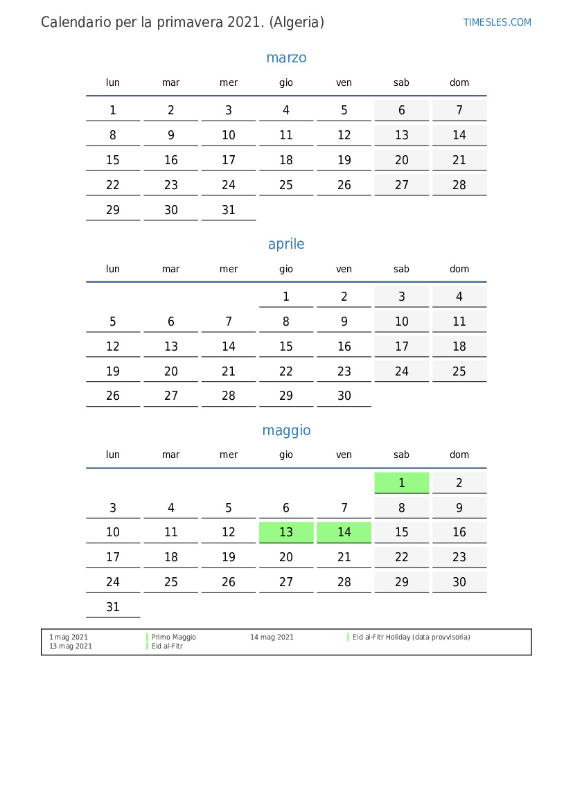 Scarica e stampa il calendario PDF con i giorni festivi e i fine settimana per la primavera 2021per l'Algeria