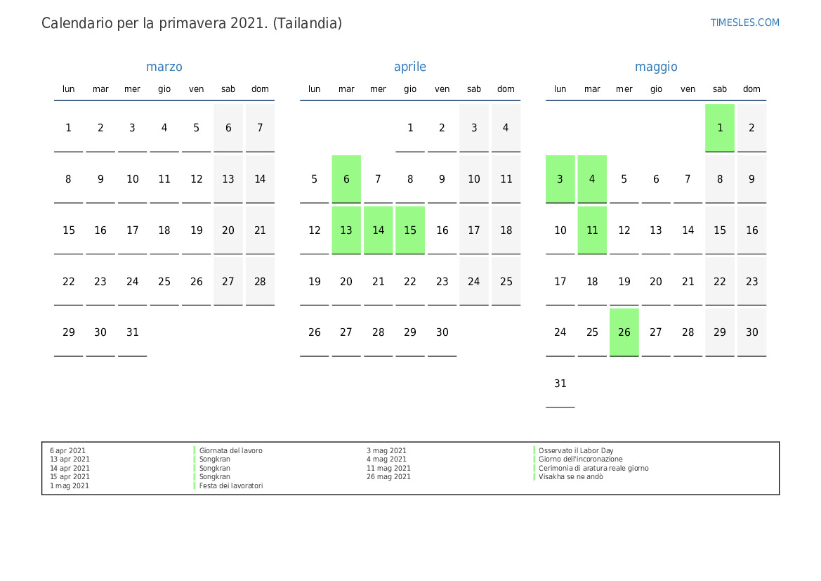 Scarica e stampa il calendario PDF con i giorni festivi e i fine settimana per la primavera 2021per la Thailandia