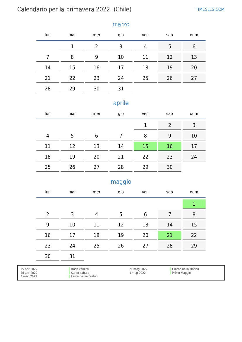 Scarica e stampa il calendario PDF con i giorni festivi e i fine settimana per la primavera 2022per il Cile