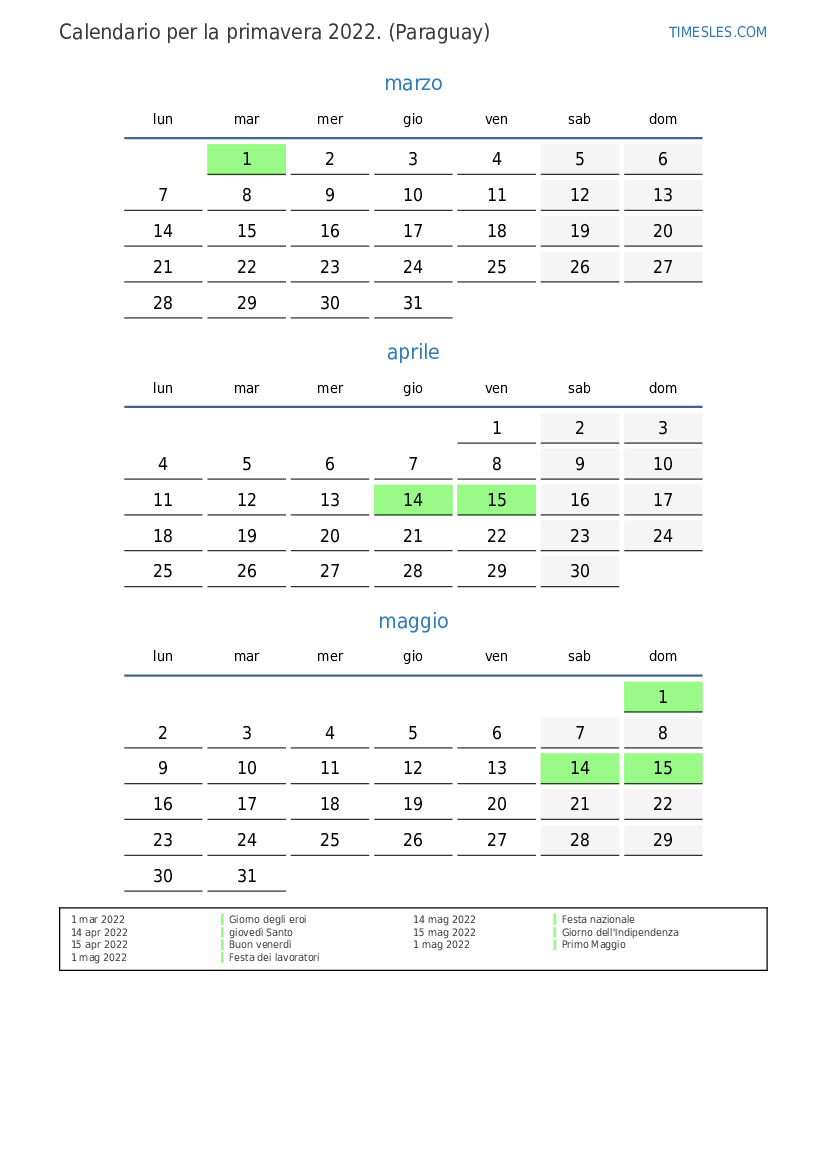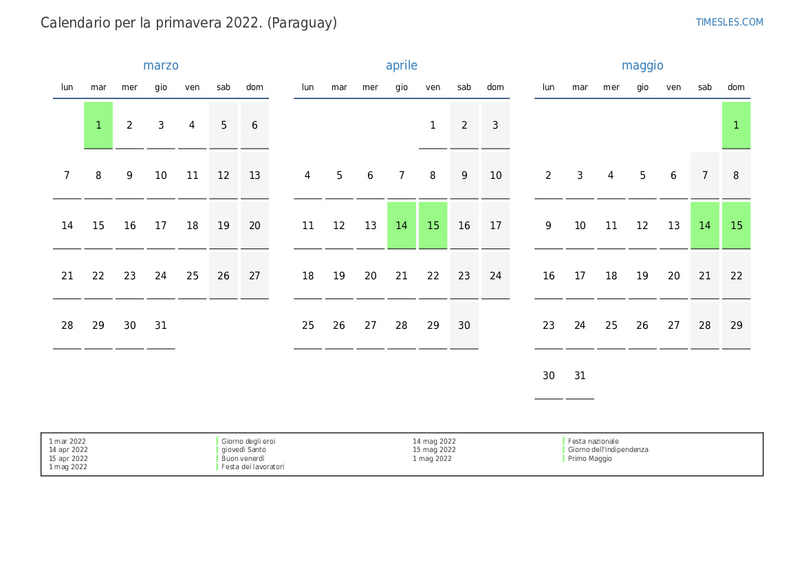 Scarica e stampa il calendario PDF con i giorni festivi e i fine settimana per la primavera 2022per il Paraguay