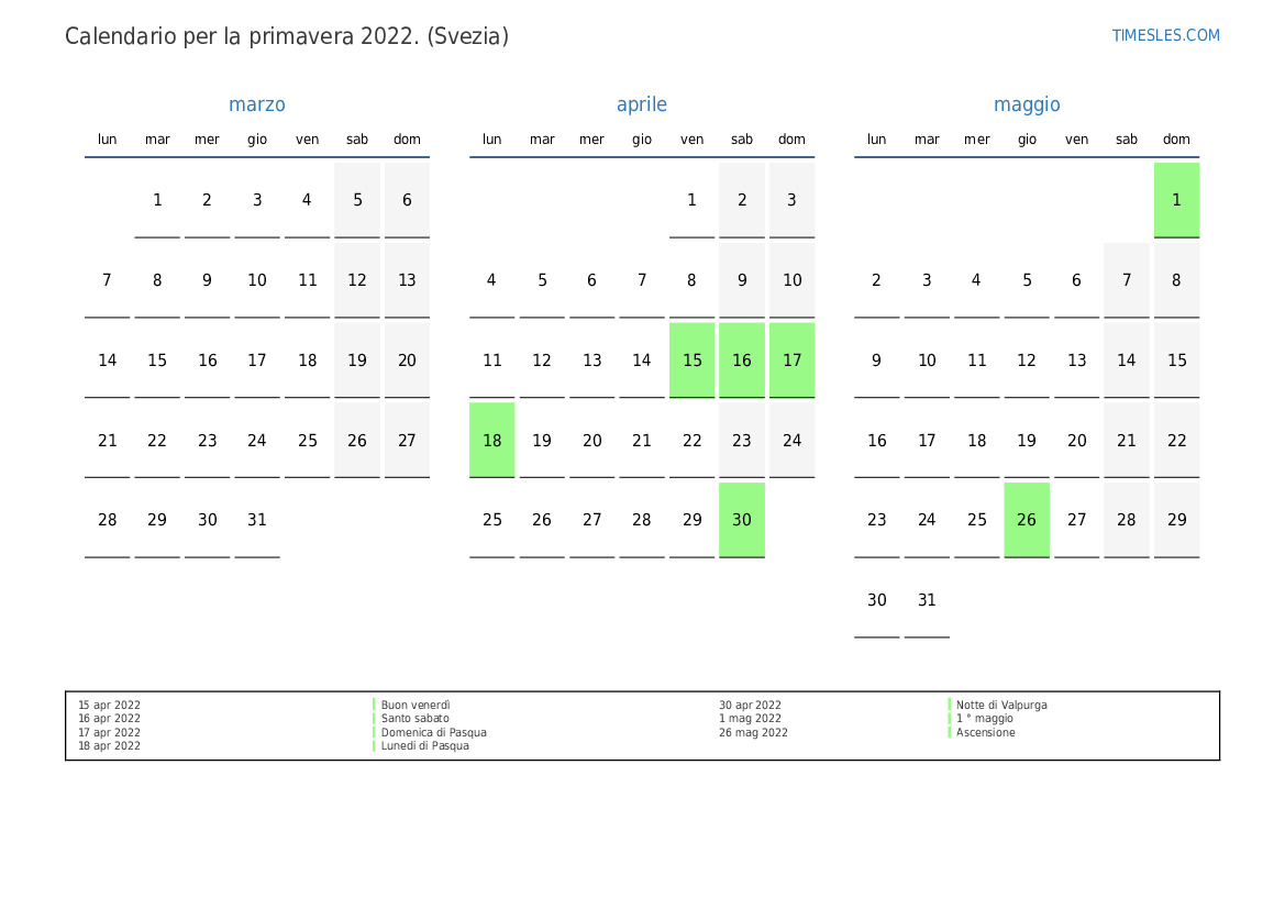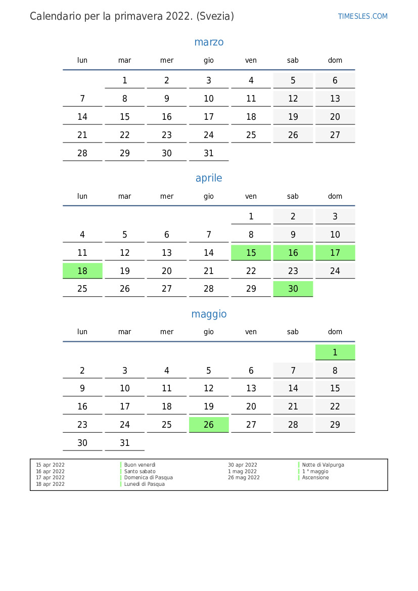 Scarica e stampa il calendario PDF con i giorni festivi e i fine settimana per la primavera 2022per la Svezia
