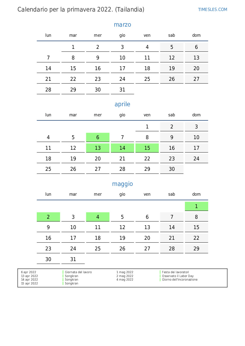 Scarica e stampa il calendario PDF con i giorni festivi e i fine settimana per la primavera 2022per la Thailandia