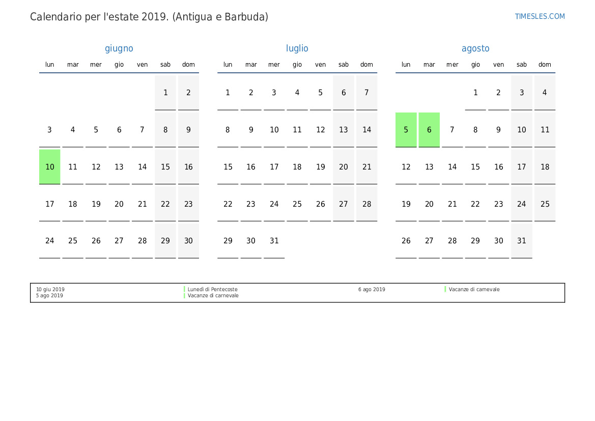 Calendario per l'estate 2019 per Antigua e Barbuda