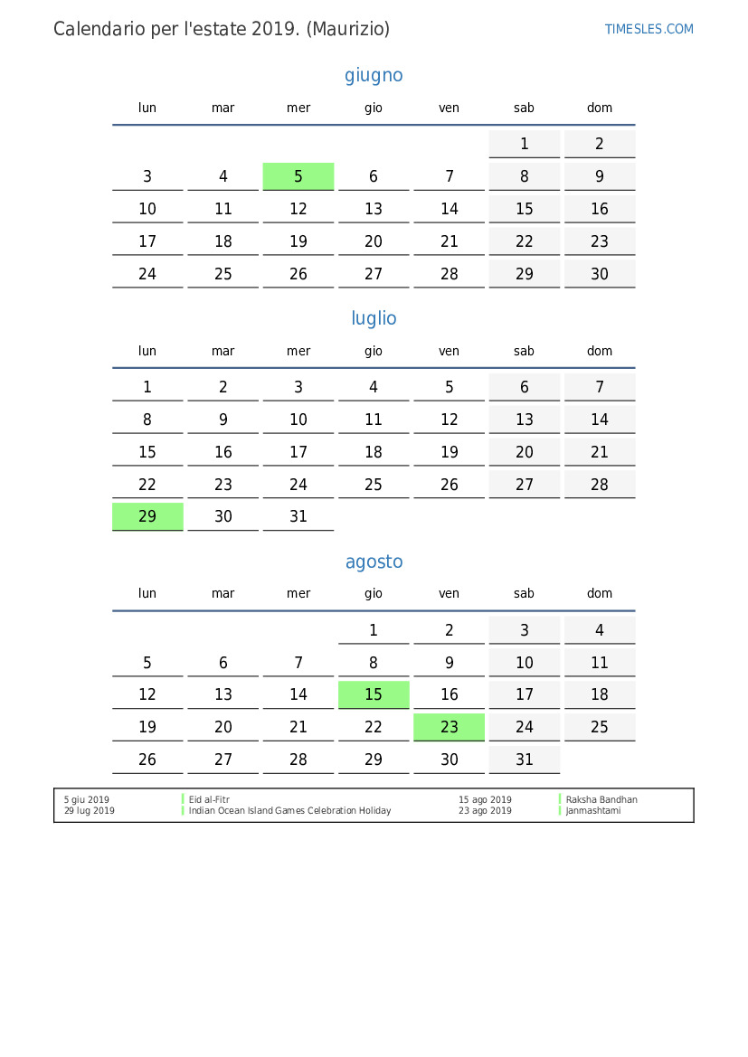 Scarica e stampa il calendario PDF con i giorni festivi e i fine settimana per l'estate 2019per Mauritius