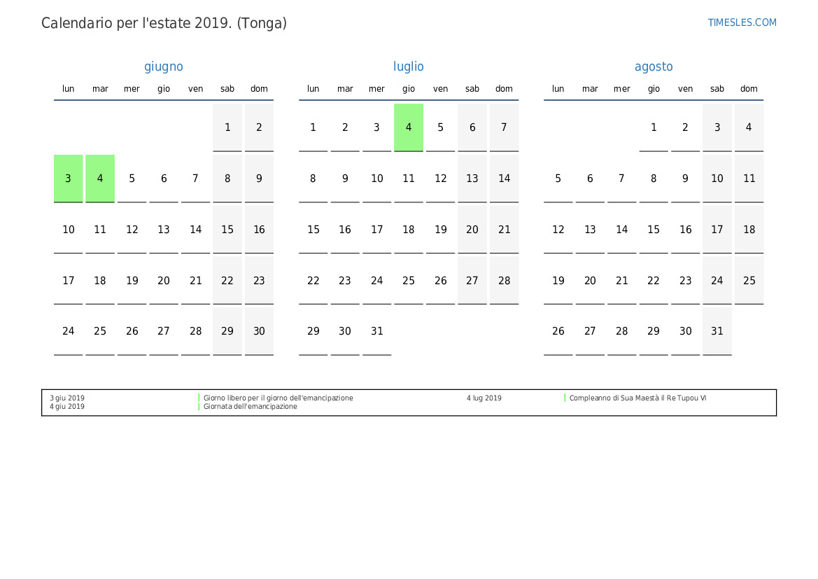 Scarica e stampa il calendario PDF con i giorni festivi e i fine settimana per l'estate 2019per Tonga