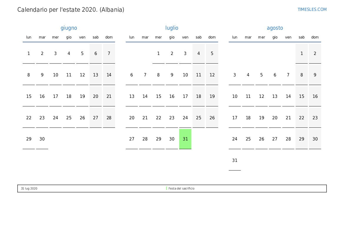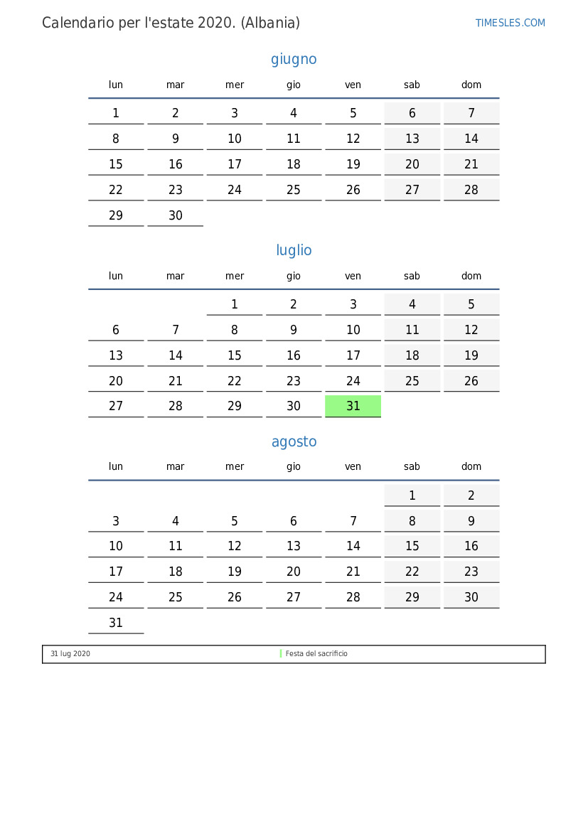 Scarica e stampa il calendario PDF con i giorni festivi e i fine settimana per l'estate 2020per l'Albania