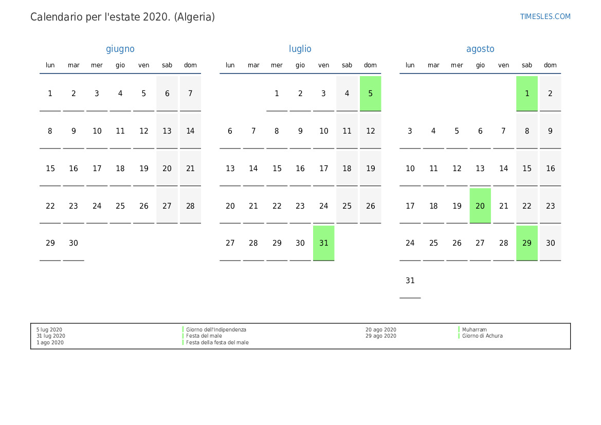 Scarica e stampa il calendario PDF con i giorni festivi e i fine settimana per l'estate 2020per l'Algeria