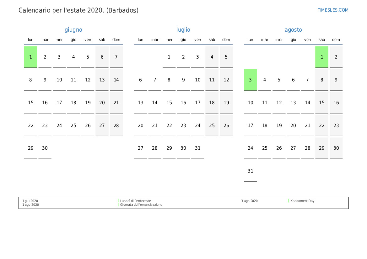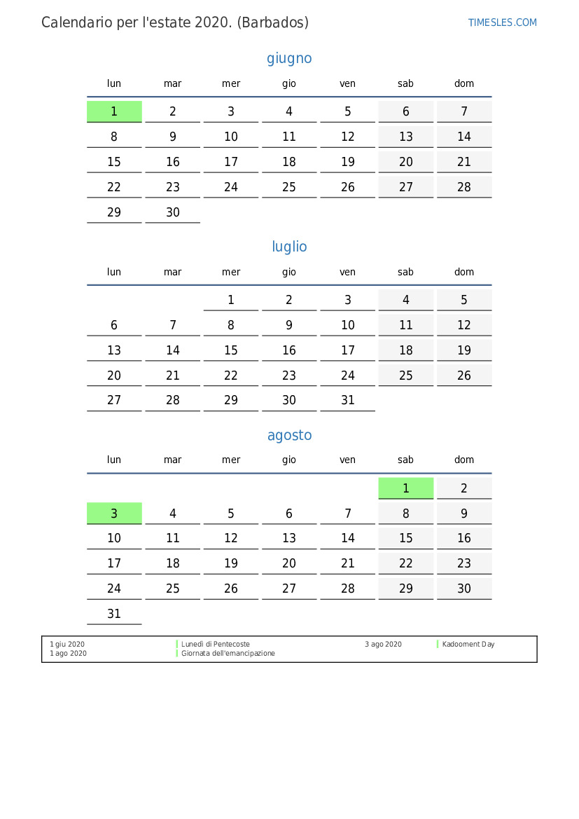 Scarica e stampa il calendario PDF con i giorni festivi e i fine settimana per l'estate 2020per Barbados