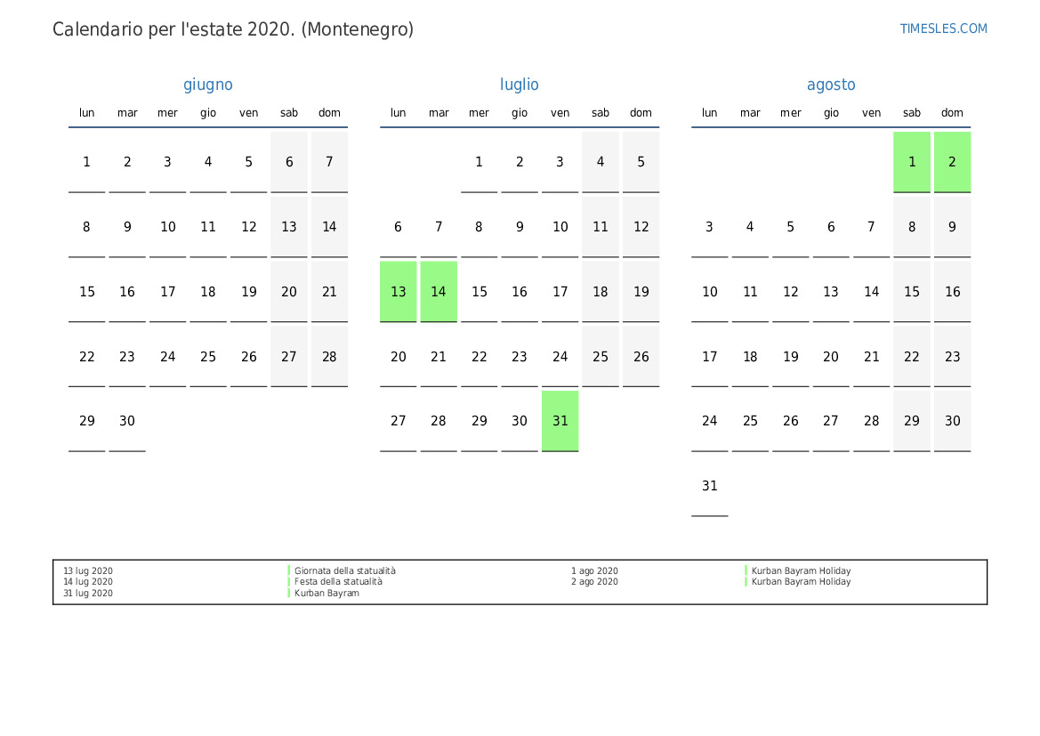 Scarica e stampa il calendario PDF con i giorni festivi e i fine settimana per l'estate 2020per il Montenegro