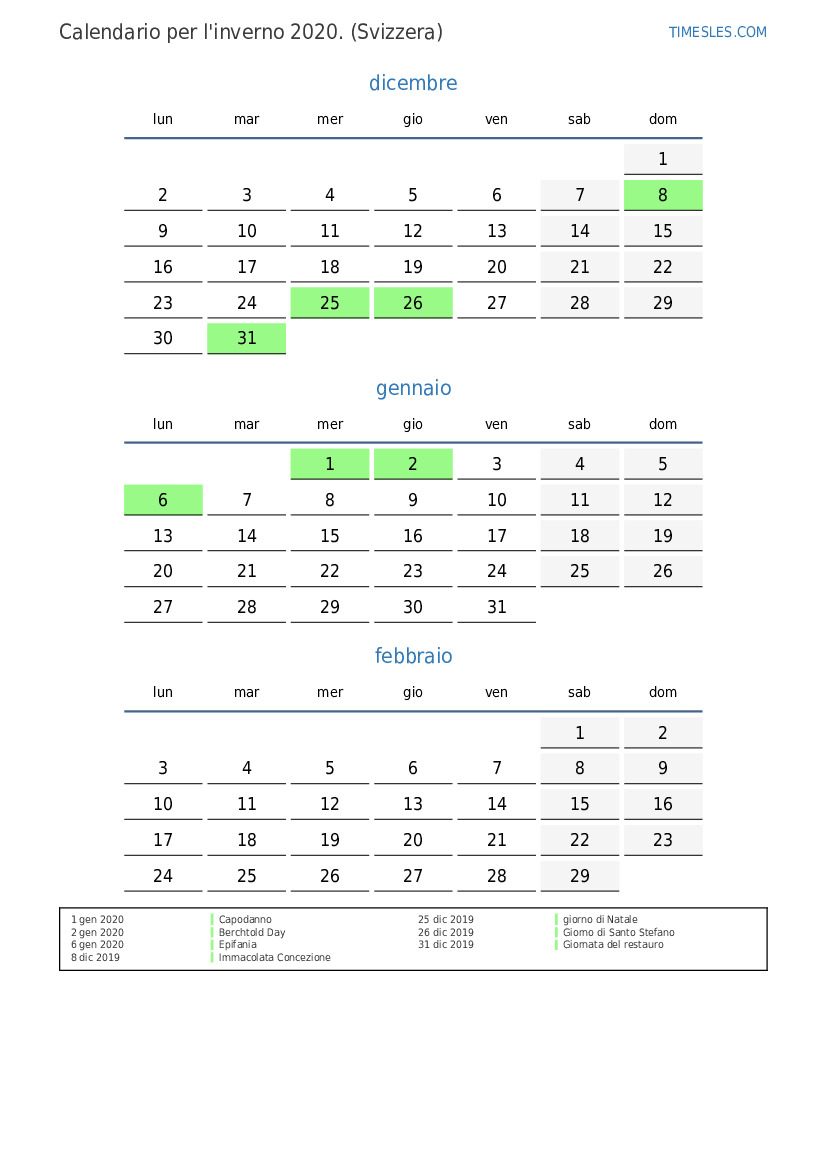 Scarica e stampa il calendario PDF con i giorni festivi e i fine settimana per l'estate 2020per la Svizzera