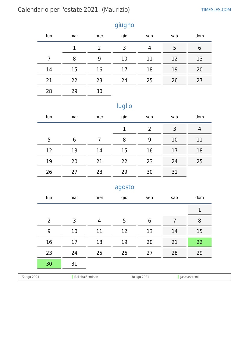 Scarica e stampa il calendario PDF con i giorni festivi e i fine settimana per l'estate 2021per Mauritius