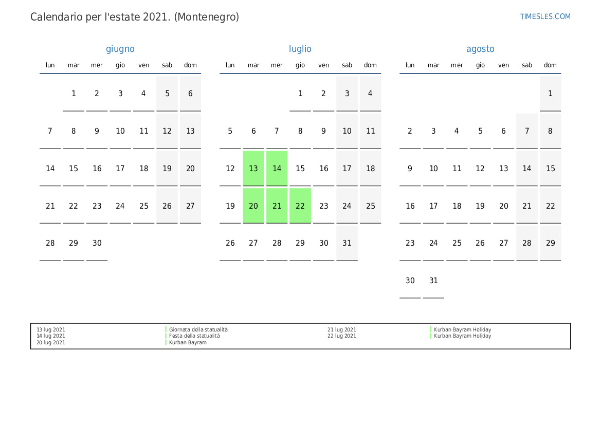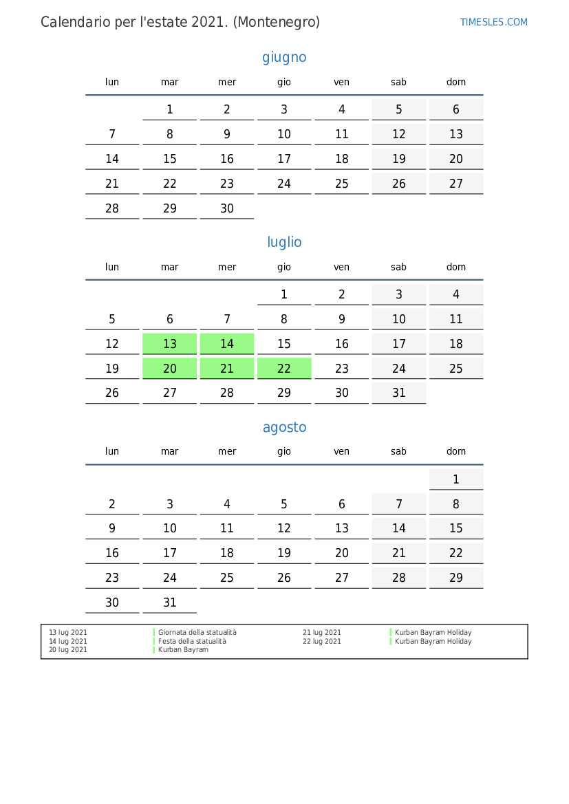 Scarica e stampa il calendario PDF con i giorni festivi e i fine settimana per l'estate 2021per il Montenegro