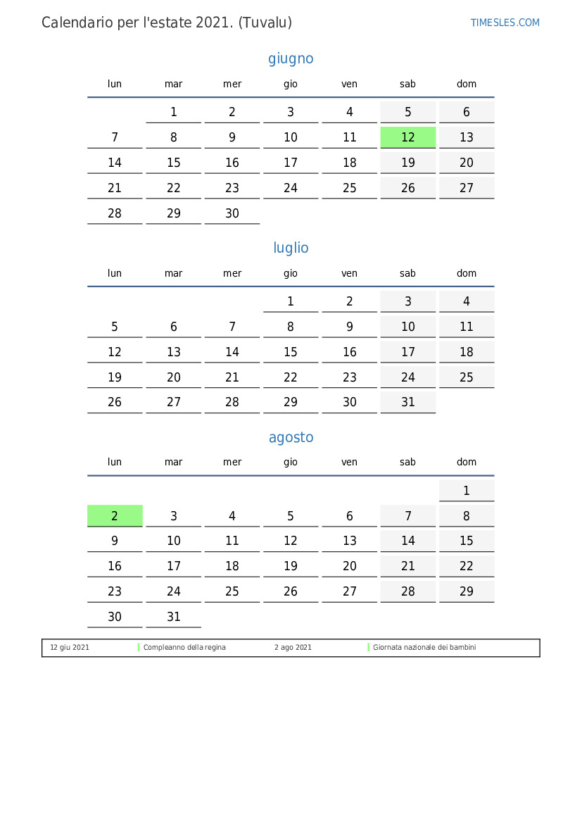 Calendario delle festività e dei fine settimana per l'estate 2021 per Tuvalu