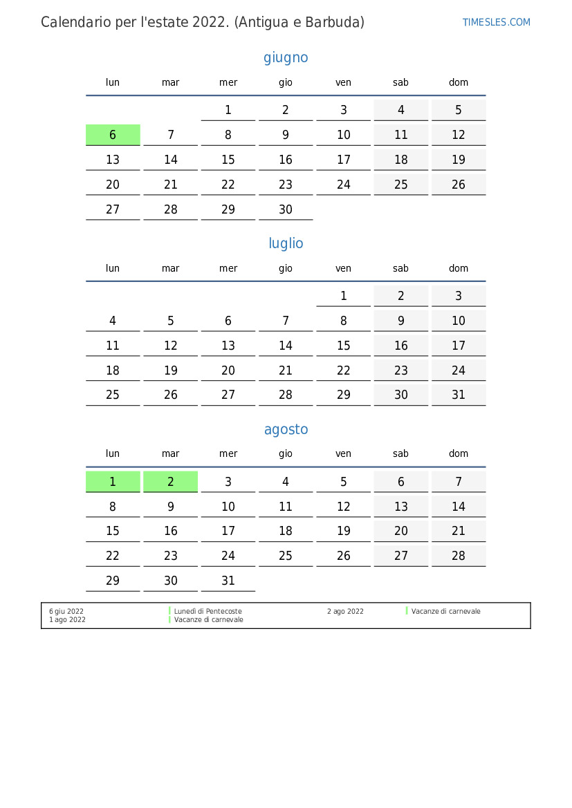 Scarica e stampa il calendario PDF con i giorni festivi e i fine settimana per l'estate 2022per Antigua e Barbuda