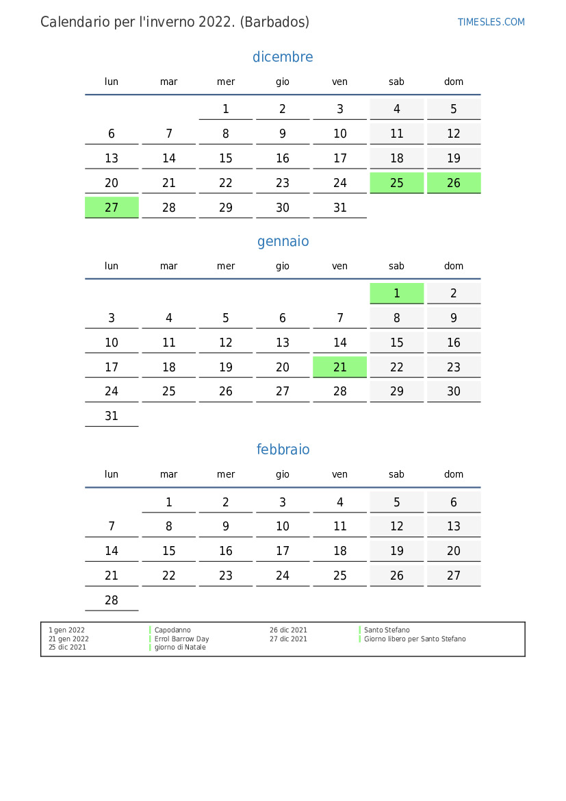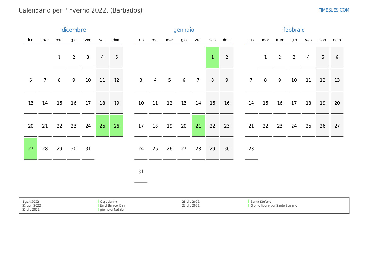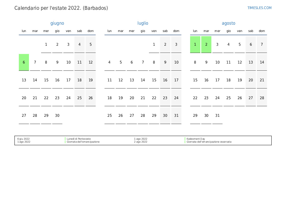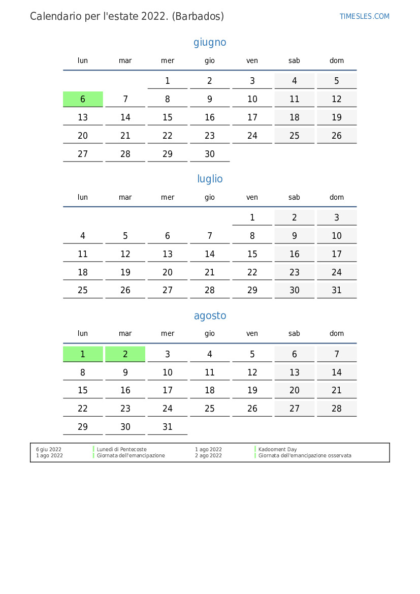 Scarica e stampa il calendario PDF con i giorni festivi e i fine settimana per l'estate 2022per Barbados