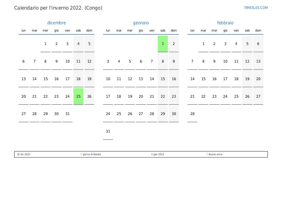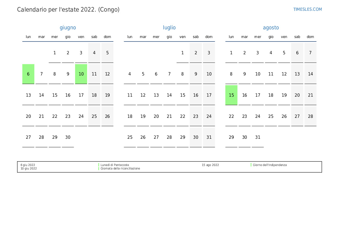 Scarica e stampa il calendario PDF con i giorni festivi e i fine settimana per l'estate 2022per il Congo