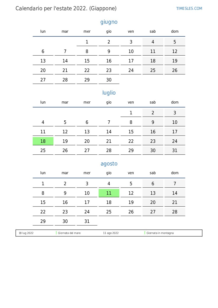 Scarica e stampa il calendario PDF con i giorni festivi e i fine settimana per l'estate 2022per il Giappone